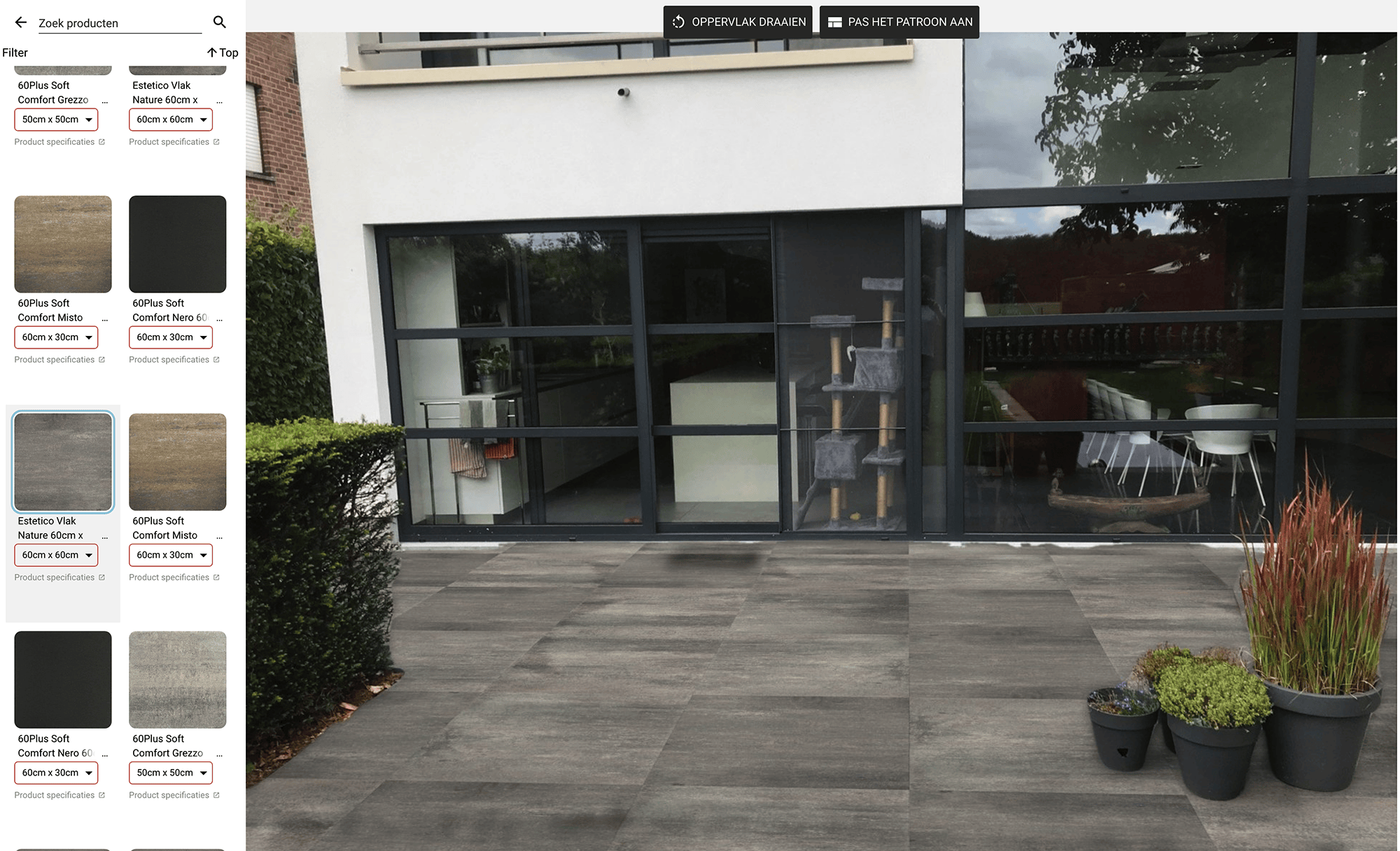 Een stenen terras vormt een prachtige aanvulling op iedere achtertuin, maar de terrastegels bij de handelaar ogen tegen de gevel van je eigen woning vaak anders. Via deze website kom je terecht op de pagina waar het programma van garDsign (zie tip 4) wordt voorgesteld, maar dat bedoelen we niet. Scrol je verder naar onderen, dan vind je daar een piepklein linkje: Probeer eens. Klik je daarop, dan kun je een eigen foto uploaden van de plaats die je wilt betegelen. In de linkerbalk krijg je een reeks vierkante en rechthoekige tegels te zien die je met één muisklik op het terras kunt toepassen. De software hield bij ons zelfs rekening met de plantenbakken die op het huidige terras staan. Je kunt ook het legpatroon en de richting van de tegels aanpassen. Zelfs al kies je niet voor dit merk, toch krijg je een goed idee van hoe een bepaalde structuur en kleur past bij de voor- of achtergevel van je huis en de tuin.