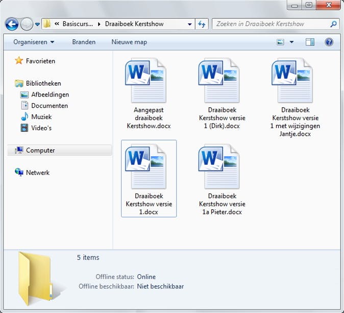 De belangrijkste vraag is wellicht: waarom zou je met meerdere personen willen samenwerken binnen één bestand? We illustreren dit met een voorbeeld uit onze eigen ervaring. Een projectgroep van vier mensen maakt samen een draaiboek voor een evenement. De eerste persoon stelt het document op en mailt het naar de rest van de projectgroep. Er zijn nu vier kopieën van het document aanwezig, op vier verschillende computers. Wanneer iedereen nu zijn ideeën aan het document toevoegt, heb je vier verschillende versies van het draaiboek, op vier locaties.