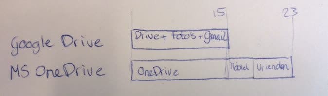 Bij Microsoft worden alle documenten opgeslagen in OneDrive. Je gratis opslagcapaciteit is ook bij deze dienst 15 GB. Je kunt dit nog uitbreiden tot 23 GB door foto's te synchroniseren met je mobiele apparaat (3 GB extra) of door vrienden uit te nodigen (500 MB per vriend, maximaal 5 GB).