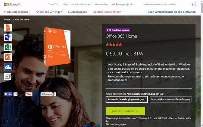 Werk je veel online én offline met office? Overweeg dan Office 365. Hierbij betaal je een abonnementsbedrag van 10 euro per maand of 99 euro per jaar. Je krijgt hiervoor altijd de nieuwste Office-versie op je computer. Ook krijg je 1 TB extra onlineopslag bij OneDrive en die ruimte wordt binnenkort zelfs onbeperkt. De Office 365-abonnementen zijn geschikt voor pc, Mac, iPad en Windows-tablets.