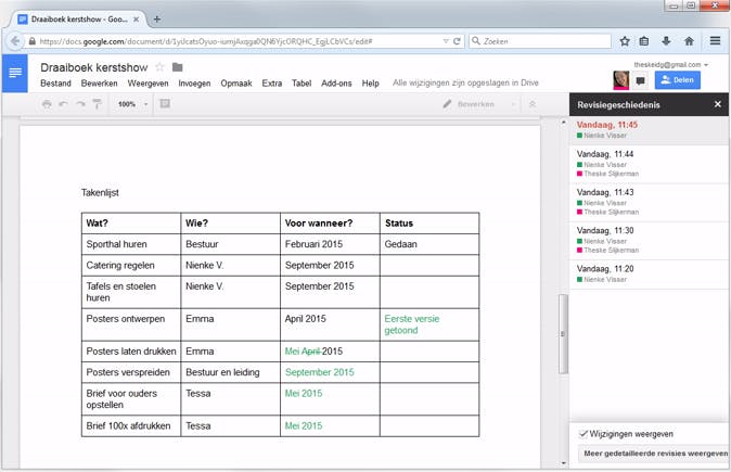 06 Rechts zie je de revisiegeschiedenis van Google Documenten. Je kunt hiermee zien wat er gewijzigd is, en vorige versies herstellen.