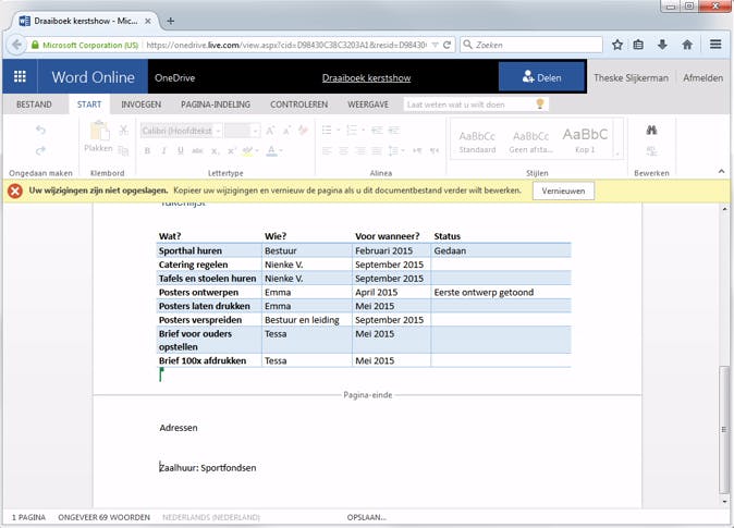 Bij een wegvallende verbinding kun je met een gerust hart doorwerken. Je wijzigingen worden offline opgeslagen en zodra je weer verbonden bent met internet, worden je wijzigingen alsnog online opgeslagen. Was je tegelijk met iemand anders op precies hetzelfde punt in de tekst aan het werk? Dan worden jullie teksten gewoon achter elkaar geplakt. Ben je dus enige tijd offline aan het werk geweest, dan is het wel verstandig het document even na te lopen. Voldoe je overigens niet aan de twee genoemde voorwaarden, dan krijg je een vergelijkbare melding als bij Microsoft.