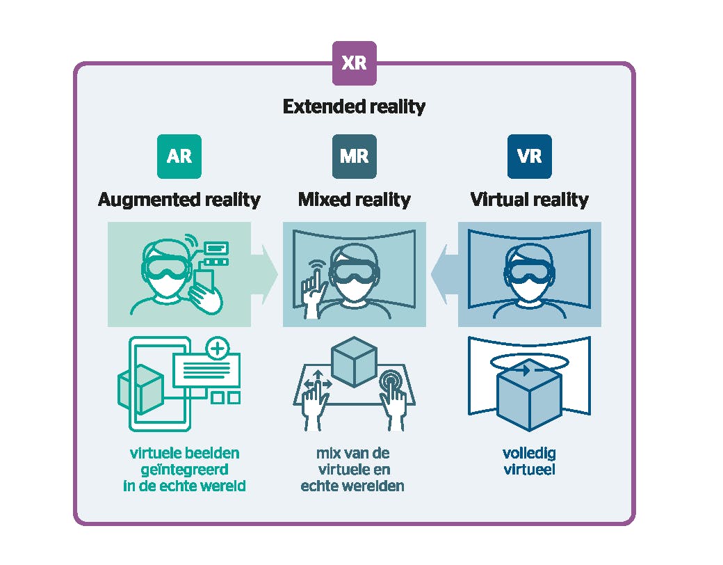 Wanneer je een virtualreality-bril (VR) opzet, verdwijnt de wereld om je heen. Je wordt ondergedompeld in een volledig virtuele omgeving. Bij augmented reality (AR) zie je de bestaande wereld nog steeds, maar de werkelijkheid wordt verrijkt. Technologie legt via een scherm een digitale laag over de echte omgeving. Daarop zie je extra informatie of objecten. Als deze virtuele objecten ook nog interactief en in realtime reageren op bijvoorbeeld je stem of handgebaren, dan noemen we het mixed reality (MR). De overkoepelende term voor VR, AR en MR is eXtended reality (XR); hierbij worden fysieke en virtuele werelden gecombineerd of uitgebreid.