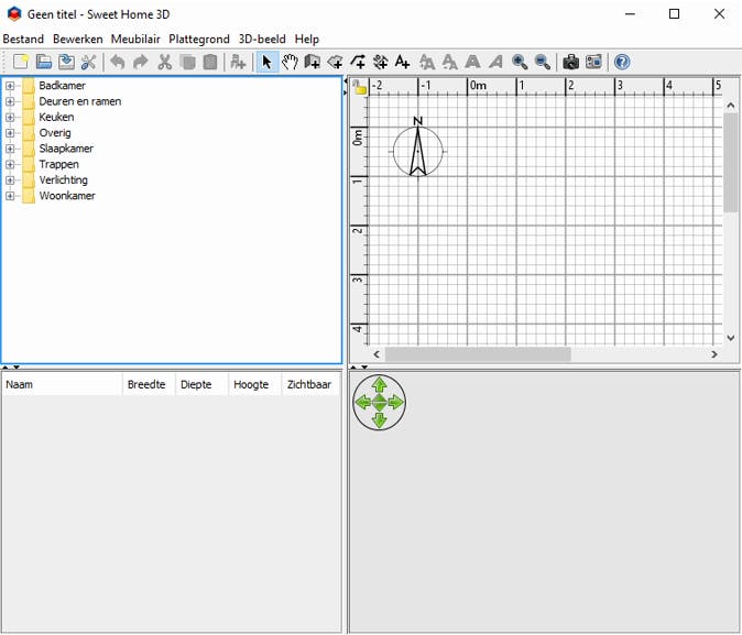 Wanneer je Sweet Home 3D opstart, zie je vier panelen voor je. Linksboven de catalogus met objecten (zoals meubilair, deuren, ramen en verlichting), rechtsboven de ontwerpruimte, linksonder een overzicht van de reeds toegevoegde objecten en rechts daarvan de 3D-weergave van je 2D-ontwerp. Op dit moment valt daar natuurlijk nog weinig te beleven, maar daar gaan we in dit artikel natuurlijk verandering in brengen. In principe kun je al meteen beginnen met het toevoegen van muren en andere objecten, maar het werkt een stuk makkelijker als je eerst al een blauwdruk of plattegrond op papier of met je favoriete tekenprogramma gecreëerd hebt.