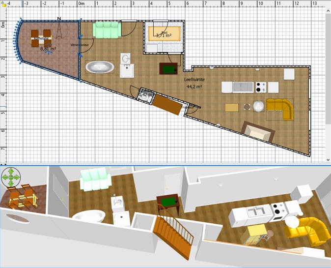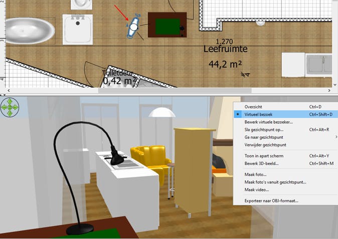 En wat dacht je van de optie Virtueel bezoek? Die zet een figuurtje in je 2D-ontwerp dat je kunt verplaatsen en waarvan je met de blauwe ronde pijlen de richtings- en hoofdhoek kunt wijzigen. Het resultaat is meteen te zien in de 3D-weergave. Zo maak je als het ware een virtuele wandeling door je huis. Overigens is het vanuit het contextmenu van deze weergave ook mogelijk een foto of zelfs een video (mov) te maken. Exporteren naar een obj-bestand (bijvoorbeeld voor verdere bewerking in een 3D-tool als Blender) kan ook en via Bestand / Print als PDF giet je alles in een mooi pdf-document. Het échte werk kan nu beginnen, en jij kunt alvast genieten van je 3D-voorbeelden.