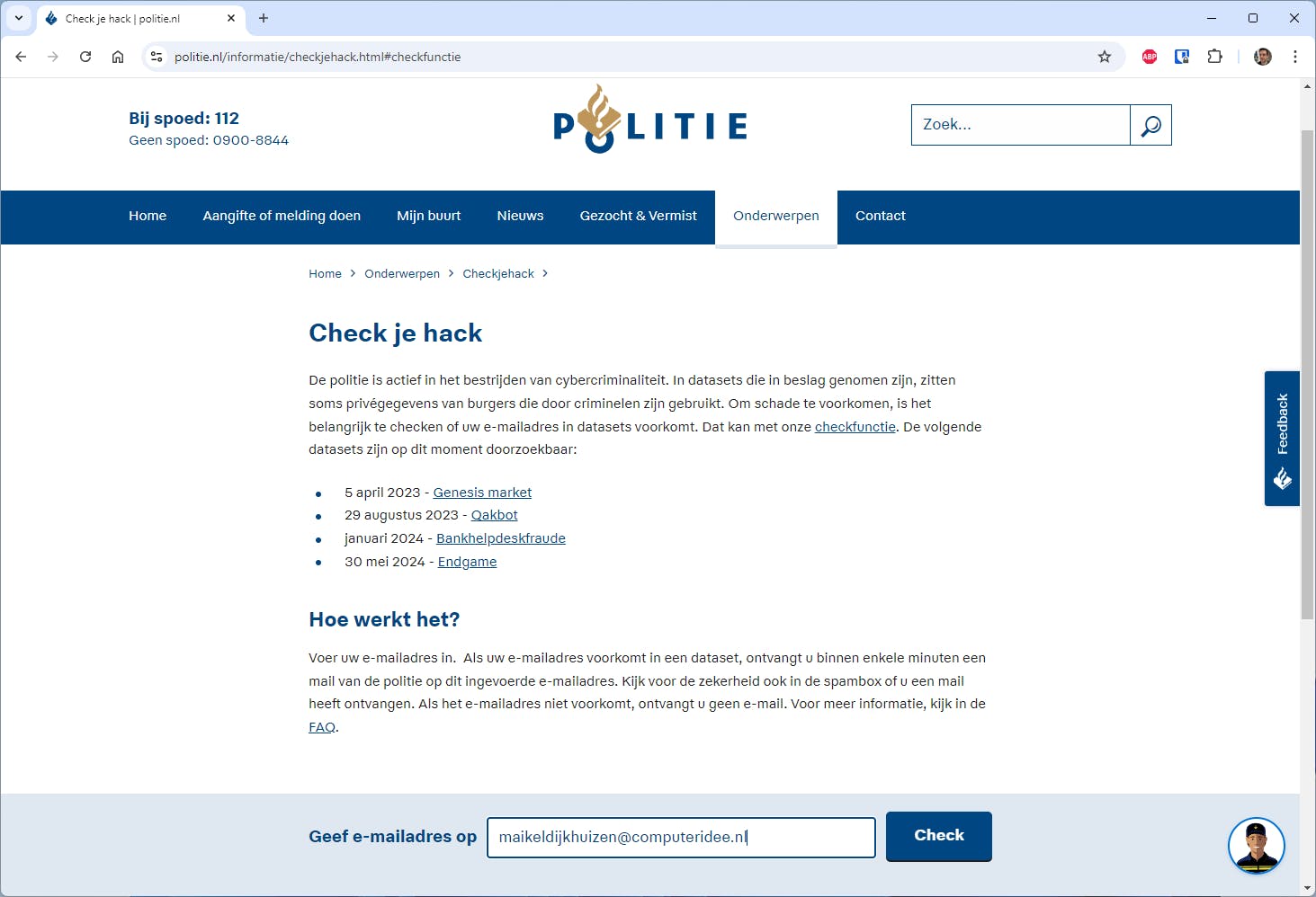 De politie onderschept geregeld datasets van cybercriminelen. Benieuwd of jouw e-mailadres in zo’n lijst voorkomt? Ga dan naar www.politie.nl/informatie/checkjehack.html en vul je e-mailadres in. Klik vervolgens op Check. Wanneer jouw e-mailadres in één van de lijsten staat, ontvang je een bericht van de politie. Hierin staan diverse tips en waarschuwingen. Heb je geen e-mail gekregen? Fijn, want dan komt jouw e-mailadres niet in een lijst voor. Houden zo!