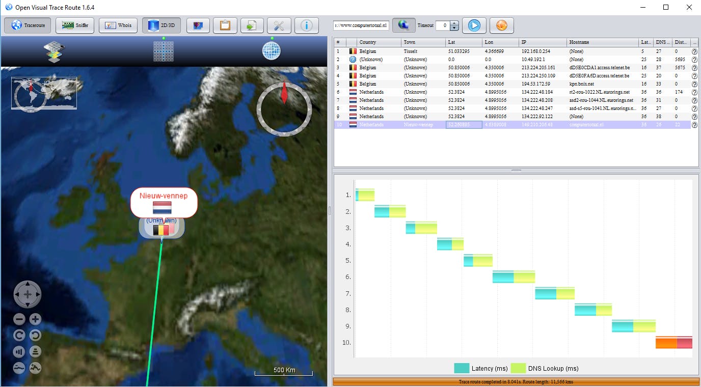 Zodra je Open Visual Traceroute opstart, een ip-adres, hostnaam of url invoert en de knop Start Traceroute indrukt, tekent het programma de gevolgde route en de diverse knooppunten (hops) uit op een wereldkaart. Tegelijk wordt elke hop in een lijst uitgezet en krijg je informatie over de geografische locatie (plaatsnaam, lengte- en breedtegraad), ip-adres en hostnaam, fysieke afstand (in km) tot de vorige hop, evenals de latentie- en dns-lookup-tijd (in ms) voor elke hop. Deze tijden laten zich ook in een grafiek aflezen. Via een systeem van selecteerbare lagen bepaal je zelf welke informatie je op de wereldbol geprojecteerd krijgt, maar jammer genoeg is de beeldresolutie erg beperkt en valt er nauwelijks nog iets te zien als je ver inzoomt.