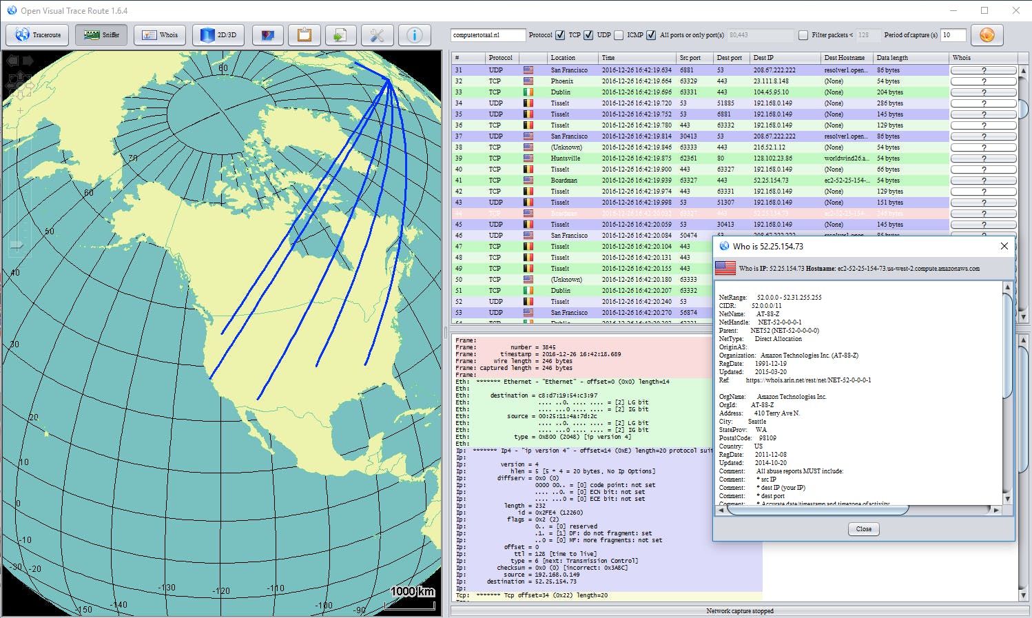 Open Visual Traceroute is een handige tool voor wie snel de route van de datapakketjes naar een bepaalde host wil kennen. De visualisatie op een wereldbol is leuk, maar heeft vooral toch gimmick-waarde. Nuttig zijn ook de whois- en sniffer-modules, maar deze laatste is wel behoorlijk uitgekleed.