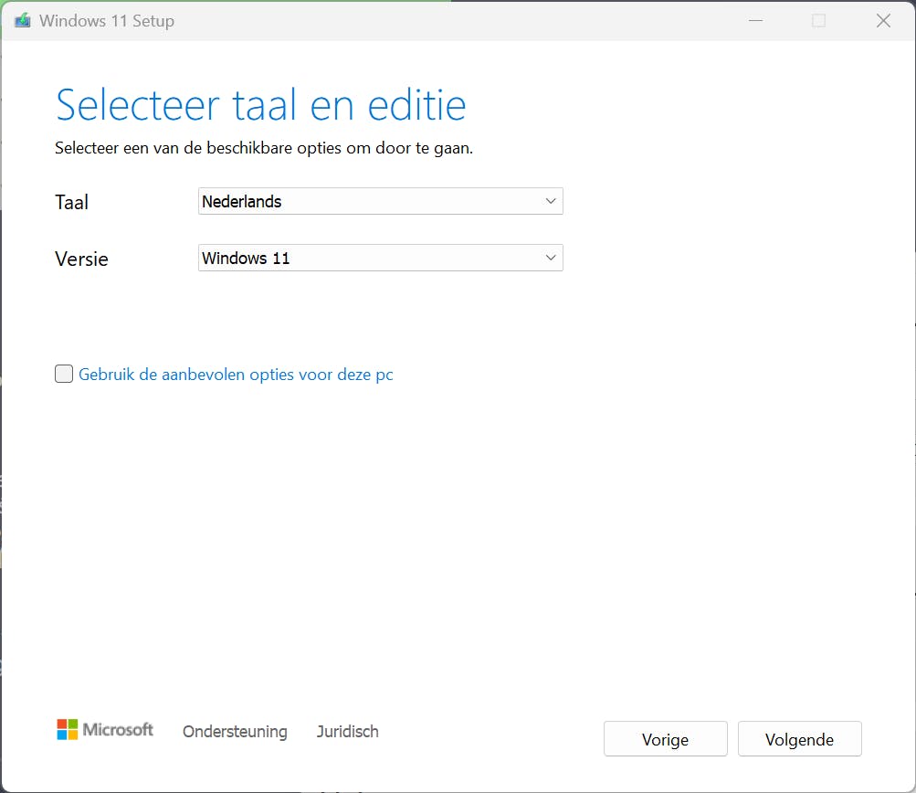 Als je het Hulpprogramma voor het maken van media gebruikt, hoef je zelf weinig te doen. Op de downloadpagina van Microsoft klik je op de knop Download nu bij de sectie Installatiemedia voor Windows 11 maken (in geval van Windows 11) of op de knop Hulpprogramma nu downloaden (in geval van Windows 10). In het hulpprogramma kies je voor Installatiemedia voor andere pc maken en klik je op Volgende. Kies nu de gewenste taal en uitvoering van Windows en klik op Volgende.