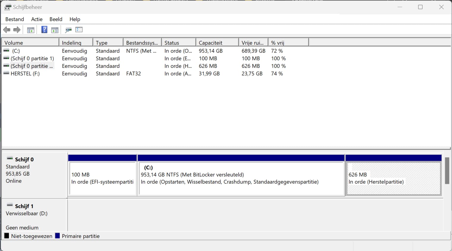 Sommige computers zijn vanuit de fabriek al voorzien van een herstelstation. De bestanden zijn dan vaak ondergebracht op een (verborgen) herstelpartitie, die je standaard ook niet ziet via Verkenner. Je kunt dit zelf controleren via Schijfbeheer. Open het Startmenu en typ Diskmgmt.msc. In onderste helft van het venster vind je een blok Herstelpartitie als deze op het systeem aanwezig is. Kun je de partitie niet vinden, dan is deze niet aangemaakt door de fabrikant.