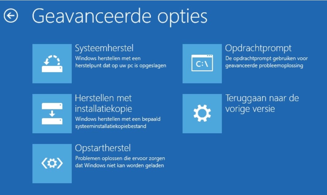 Interessanter is echter de sectie Geavanceerde opties. Deze sectie bevat gereedschap waarmee je een groot deel van de problemen kunt verhelpen. Maak je met behulp van Systeemherstel regelmatig een herstelpunt? Roep dan via Systeemherstel een overzicht van herstelpunten op en kies een punt waar Windows naar moet terugkeren. Uiteraard is deze optie niet van toepassing als je geen herstelpunten maakt.