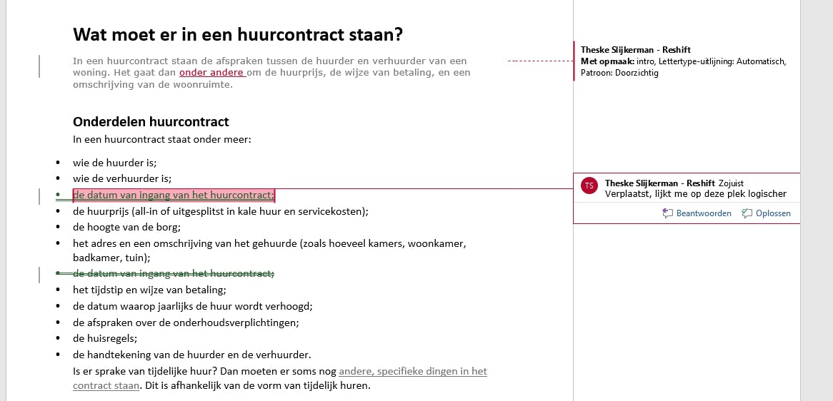 Wil je in dialoog gaan met de auteur of vraag je je iets af bij een stukje tekst? Laat dan een opmerking in het document achter. Op die manier kun je een alternatief woord suggereren of aangeven dat een bepaalde zin misschien beter verwijderd kan worden. Om een opmerking te plaatsen, selecteer je eerst een zin, woord of volledige alinea. Vervolgens klik je op het tabblad Controleren bij Opmerkingen op Nieuwe opmerking. Je krijgt een tekstvak in de rechterkolom waar je een boodschap kunt typen. Het is zelfs mogelijk om hier bepaalde woorden cursief of vet te zetten.