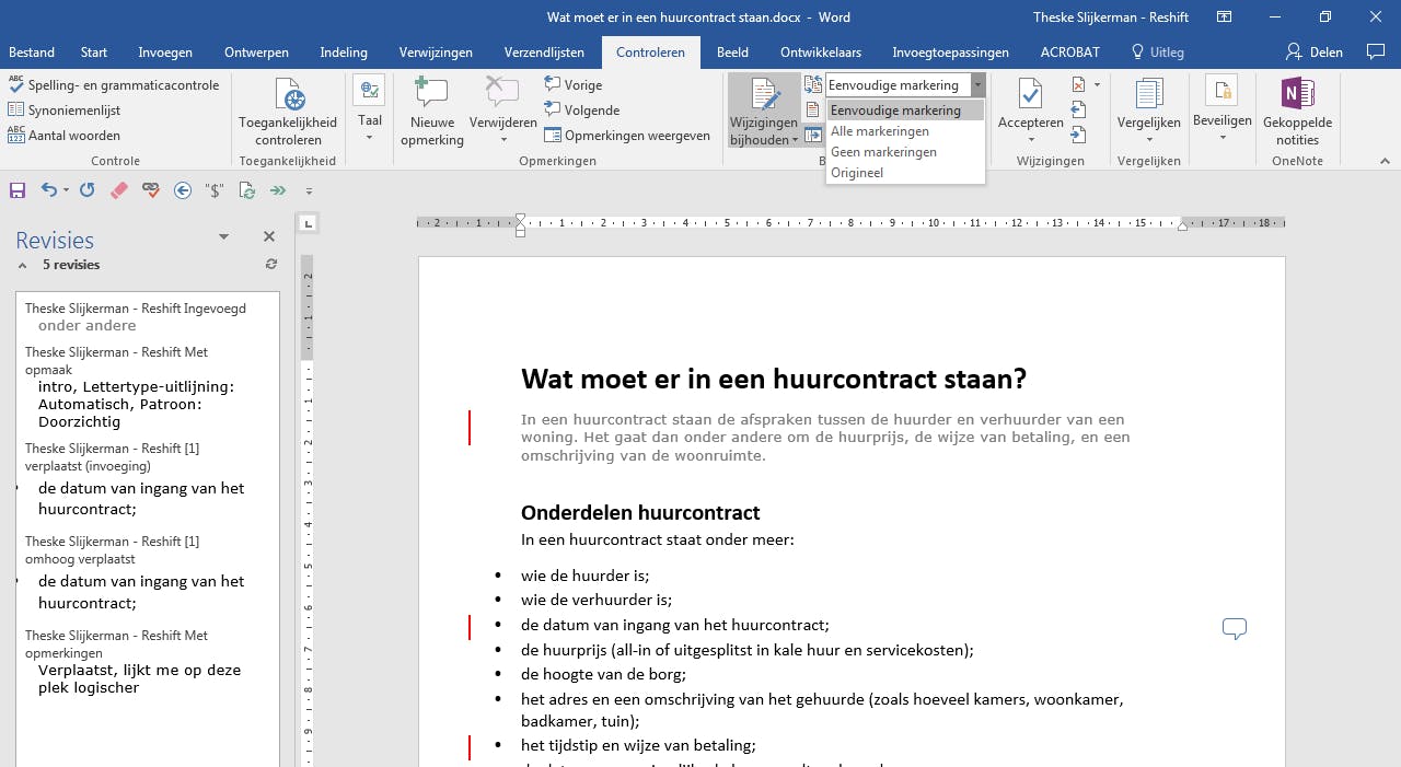 Ben je helemaal door de tekst heen? Als je veel wijzigingen hebt doorgevoerd met de bijhouden-functie aan, dan kan het document onoverzichtelijk ogen. Via Controleren / Bijhouden kun je switchen van Alle markeringen (waarin je alle uitleg van de wijzigingen ziet) naar een van de andere opties. Met Eenvoudige markering zie je alleen de strepen naast de tekst waar iets gewijzigd is. Met Geen markeringen zie je de volledig aangepaste tekst en met Origineel verberg je alle wijzigingen. Voor een extra controle zet je deze modus op Geen markeringen en neem je de tekst nog een laatste keer door. Kies daarna Bestand / Opslaan als en geef je document een andere naam. Bijvoorbeeld de originele bestandsnaam gevolgd door jouw initialen of ‘versie 2’.