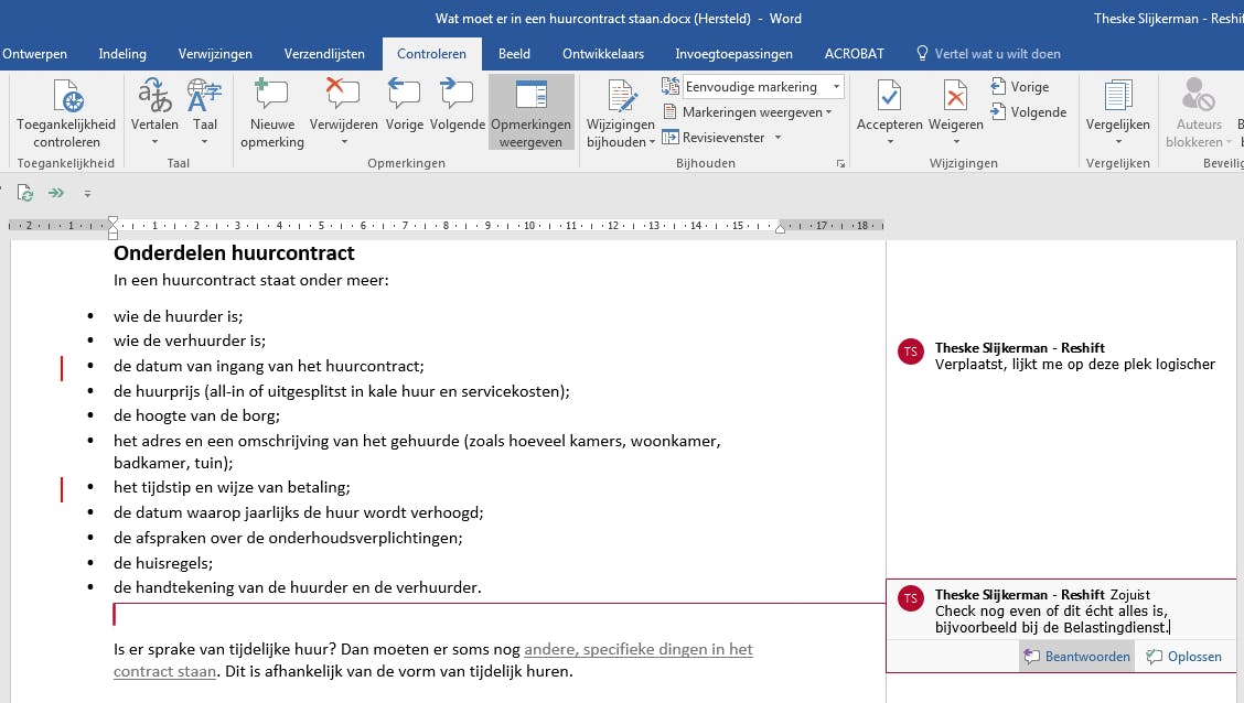Staan er ook opmerkingen in je document? Neem ze door. Je kunt een opmerking waar je niets meer mee hoeft te doen, verwijderen via Controleren / Opmerkingen / Verwijderen. Wil je in discussie gaan met degene die de opmerking heeft gemaakt, klik dan op de opmerking, kies Beantwoorden en typ je antwoord. Ben je tevreden met de bewerkte tekst? Zorg dan dat je alle opmerkingen en wijzigingen die je níet wilt doorvoeren weigert of verwijdert. Dit staat anders zeer onprofessioneel. Klik daarna Bestand / Opslaan als en geef je document de definitieve naam.