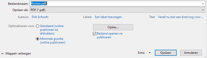 Een nadeel van deze keuze is dat het bestand groter is dan in de tweede keuze Minimale grootte. Met die optie is het document prima leesbaar op een computerscherm, maar bij foto’s merk je de lagere kwaliteit in de afdruk.