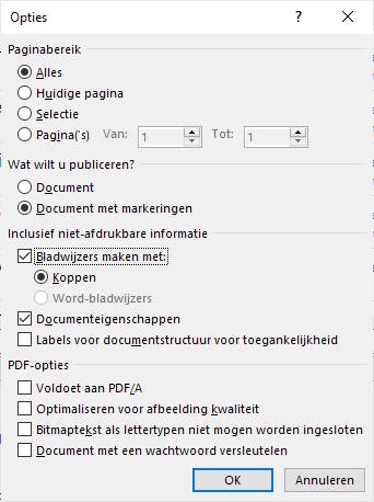 Wat wil je publiceren? Wil je het zichtbare document omzetten naar pdf? Of wil je een pdf produceren van het document, inclusief de markeringen die jezelf of anderen bij het redigeren hebben aangebracht in het Word-document?