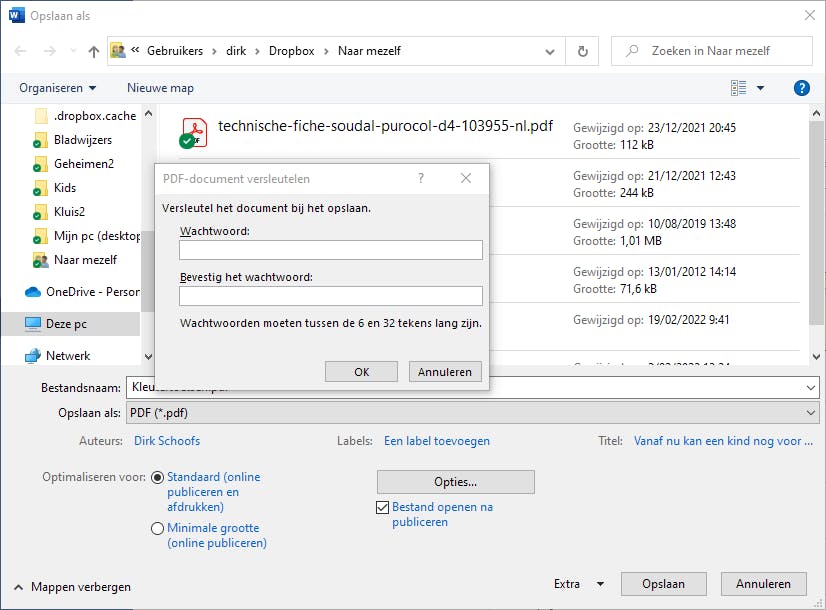 Wanneer je in het Word-document de standaard stijlen Kop1, Kop 2 enzovoort hebt gebruikt – iets wat we altijd aanraden – kun je die laten omzetten als bladwijzers in de pdf. Dat maakt het navigeren door een lijvig document makkelijker. Tenslotte is er een keuzevakje om het pdf-document te versleutelen met een wachtwoord. Als je dit aanvinkt, verschijnt er een pop-up waarin je het wachtwoord typt dat nodig is om dit pdf-bestand te openen.