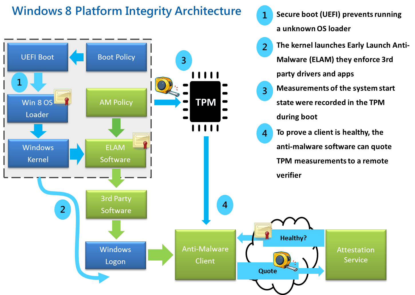 Secure Boot is een onderdeel van uefi en is bedoeld om malware die de firmware aanvalt tegen te houden. Zulke malware is erg naar, want die kan namelijk een herinstallatie van het besturingssysteem overleven doordat die zich in de firmware nestelt. Het principe van Secure Boot is erg eenvoudig: alleen binary’s (bestanden met alleen code) die ondertekend zijn door een vertrouwde partij worden opgestart. Malware kan in theorie niet ondertekend worden, dus daarmee wordt malware dan geblokkeerd. Bedrijven kunnen hun uefi-binary door Microsoft laten ondertekenen. In de meeste uefi’s zijn de publieke sleutels van Microsoft aanwezig. Als een bedrijf zijn binary laat ondertekenen, dan gebeurt dit dus met Microsofts privésleutel, zodat de firmware die binary herkent en start.