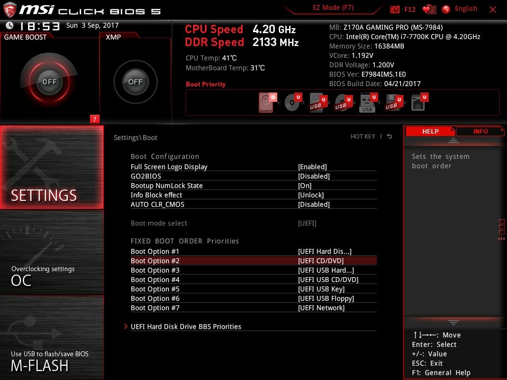 Sommige fabrikanten bieden tooltjes aan waarmee je de uefi-instellingen via Windows kunt wijzigen. Dat is een stuk eenvoudiger, dan kun je misschien rustiger eens rondkijken met de handleiding van je moederbord ernaast.