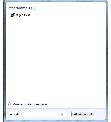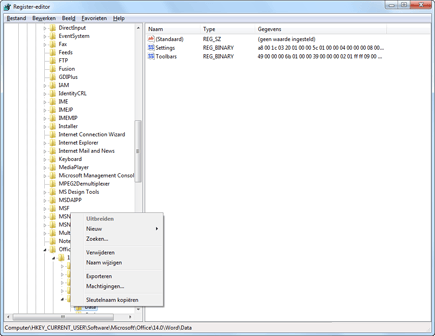 De instellingen van Word worden centraal opgeslagen in het register van Windows. Dit gebeurt in de Registersleutel Data, wat inhoudt dat wanneer u deze sleutel weggooit, automatisch ook alle instellingen (inclusief mogelijk conflicterende instellingen) worden verwijderd. U verwijdert de sleutel met behulp van de registereditor. Zorg er eerst voor dat Office volledig gesloten is (Word is al gesloten, het programma crasht immers steeds). Klik op het menu Start en typ in het invoerveld onderin: regedit. Klik op Ja indien u een melding krijgt van Gebruikersaccountbeheer. De registereditor wordt nu gestart. Blader nu in het linkerdeelvenster naar de waarde HKEY_CURRENT_USER \ Software \ Microsoft \ Office \ 14.0 \ Word \ Data. Het getal 14.0 in deze navigatie staat voor Word 2010, voor Word 2007 is dit 12.0, voor Word 2003 is dit 11.0.