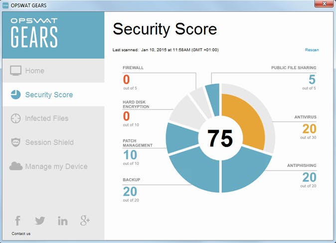 De score blijkt opgebouwd uit deelscores voor firewall, schijfencryptie, patchbeheer, back-up, bestandsdeling, antivirus en antiphishing. Je kunt een toelichting krijgen, zodat je precies weet waarom je firewall bijvoorbeeld 0 op 5 kreeg of je antivirus 20 op 30. Let wel, Opswat GEARS mag je dan concrete tips aanreiken (zoals 'Last definition update is more than 2 weeks ago' of 'Microsoft OneDrive is not backed up'), je moet zelf de actie ondernemen en dus weten hoe je dat aanpakt.