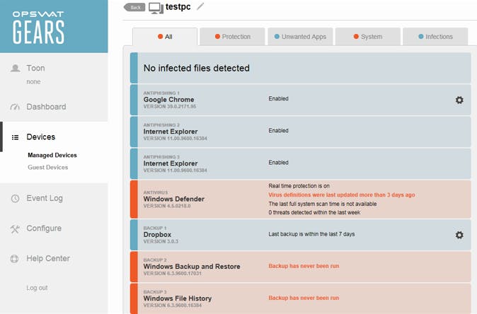 Opswat GEARS is een doordachte combinatie van een lokale applicatie en een cloudservice. Deze laatste maakt ook controle op afstand mogelijk, zelfs van meerdere pc's.