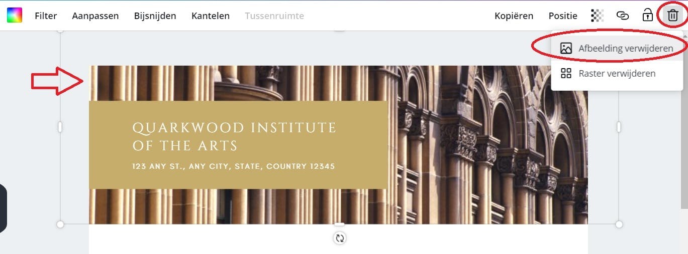 Laten we beginnen bij hetgeen dat je als eerste ziet bij deze brief: de afbeelding van de pilaren van een kerk. Tenzij je bij het klooster gaat solliciteren is dit misschien niet het beste plaatje om je brief mee op te maken. Klik daarom op het plaatje en wanneer er een stippenlijn omheen verschijnt, op de prullenbak rechtsboven. Kies vervolgens voor afbeelding verwijderen. Wanneer je voor ‘raster verwijderen’ kiest, verdwijnt het element waarin je het plaatje kan plaatsen. Dit wil je voor nu niet.