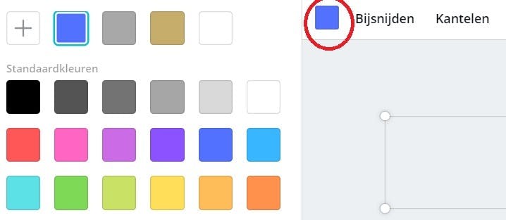 Zoals gezegd kun je alles bewerken. Ook de achtergronden van elementen. In dit geval veranderen we alleen de kleur van het tekstvlak op de afbeelding. Klik hiervoor op het tekstvlak en klik linksboven op het gekleurde vierkantje.