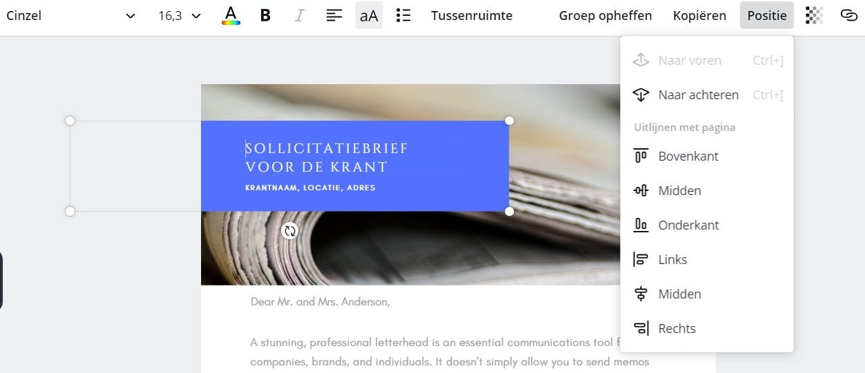 Je kunt zelf nog van alles toevoegen, mocht je er een dolle boel van willen maken. Je kan losse afbeeldingen en illustraties in je brief plaatsen. Mocht je een ontwerp in een bepaalde volgorde willen zien, dan kan je de positie van je afbeelding rechtsboven bepalen. Door ‘naar voren’ of ‘naar achteren’ te kiezen, verplaatst het element zich dusdanig, waardoor je meerdere afbeeldingen, kleuren en tekstvlakken over elkaar heen kan zetten. Dit is vooral handig wanneer je een logo ontwerpt.