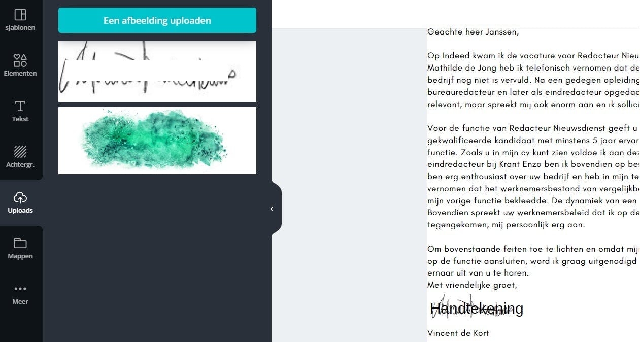 Wil je een eigen handtekening toevoegen aan het eind van je brief? Ook dat is mogelijk. Canva biedt de opties om zelf foto’s en afbeeldingen te uploaden, die je vervolgens weer in de templates kunt gebruiken. Maak een foto van je handtekening en upload deze in het linker menu. Vervolgens sleep je deze naar de plek waar je hem hebben wil. Ook hier kan je er weer voor kiezen om de volgorde te veranderen. Plaats bijvoorbeeld je handtekening net boven je naam waarmee je de brief afsluit en laat je naam en de handtekening elkaar overlappen door de handtekening afbeelding naar de achtergrond te verplaatsen.