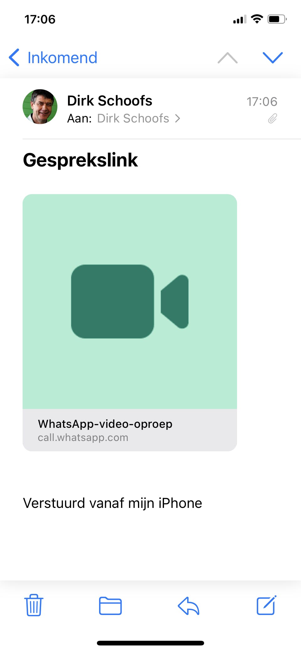 Je kunt de link ook buiten WhatsApp delen, bijvoorbeeld via e-mail. Iedereen die de gedeelde link opent, komt automatisch terecht in WhatsApp. Een ideale manier om groepsgesprekken te organiseren. Verspreid de koppeling en vraag iedereen om deze in hun agenda vast te leggen op bijvoorbeeld donderdag om 15.00 uur. Zo’n deelbare bel-link maak je in WhatsApp via de knop Gesprekken. Daar zie je de knop Maak gesprekslink. Iedere WhatsApp-gebruiker kan zo’n uitnodiging maken; je hoeft dus geen beheerder van een groep te zijn.