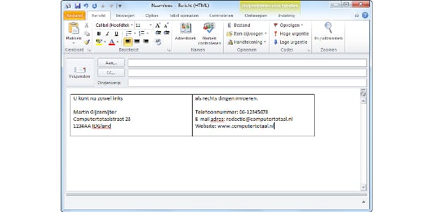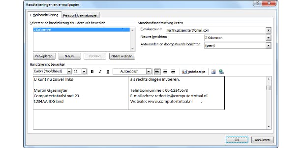 Standaard wordt deze handtekening nu aan nieuwe berichten toegevoegd, maar die instelling kun je in dit venster wijzigen. Het prettige is dat, wanneer je dit venster opent, je de tekst direct kunt bewerken, je hoeft daarvoor niet eerst weer terug naar de berichteneditor en het geheel daarna opnieuw te kopiëren. Een extra kolom invoegen kan in dit venster helaas niet, daarvoor zal je wel terug moeten naar de berichteneditor.