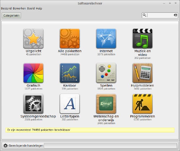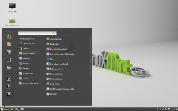 Klik je linksonder op het menu-icoontje of het woord Menu, dan ontvouwt zich het hoofdmenu. Standaard staan alle toepassingen geselecteerd en krijg je in de rechterkolom van het menu alle beschikbare toepassingen alfabetisch in een lijst. Selecteer je daarentegen een categorie onder Alle toepassingen, dan krijg je alleen de programma's in die categorie te zien, wat overzichtelijker is. Je kunt ook in het zoekveld beginnen te typen. Een klik op een icoontje start het programma. Rechtsklik je op een icoontje, dan krijg je eronder de mogelijkheid om het icoontje aan de snelkoppelingen in het paneel toe te voegen, op het bureaublad te plaatsen, aan de favorieten in de linkerkolom van het hoofdmenu toe te voegen of om de software te verwijderen. Onder de favorieten staan knopjes om het scherm te vergrendelen met je wachtwoord, af te melden en de computer uit te schakelen.