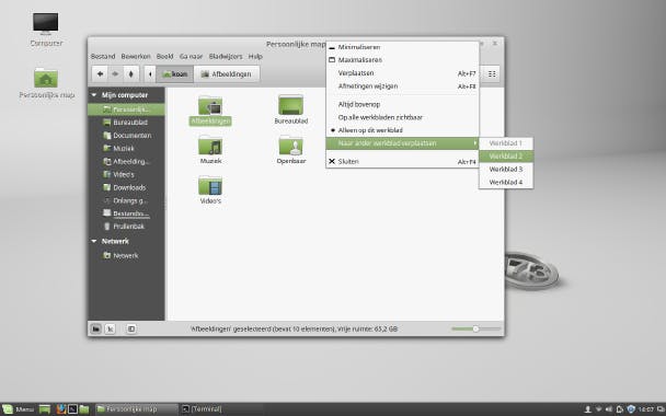 Klik je bij de snelkoppelingen of in de favorieten van het hoofdmenu op het groene icoontje van de map of dubbelklik je op het bureaublad op Persoonlijke map, dan start het programma Nemo. Dit is te vergelijken met Verkenner in Windows. Het opent je persoonlijke map, met daarin mappen zoals Afbeeldingen, Bureaublad, Documenten, Downloads, Muziek en Video's. Dubbelklik op een map om de inhoud te bekijken of op een bestand om het met zijn standaardprogramma te openen. Rechtsklik je op een map of bestand, dan krijg je nog andere mogelijkheden, waaronder een submenu Openen met om een bestand in andere toepassingen dan de standaardtoepassing te openen. Dit werkt dus hetzelfde als in Windows.