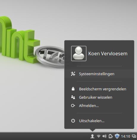 Het systeemvak met notificatie-icoontjes herbergt in weinig ruimte heel wat functionaliteit. Op elk icoontje kun je klikken om meer informatie te tonen of rechtsklikken om in te stellen welke informatie je te zien krijgt. Zo krijg je met een klik op het icoontje van de persoon snelle toegang tot de systeeminstellingen en enkele handige acties: het beeldscherm vergrendelen, van gebruiker wisselen, afmelden en de computer uitschakelen.