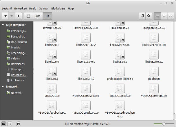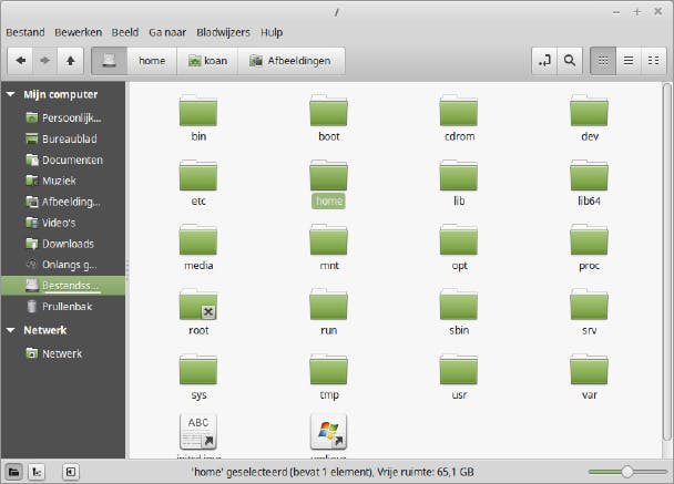Klik je in de zijbalk van Nemo links op Bestandssysteem, dan krijg je de hele inhoud van je Linux-bestandssysteem te zien. Daar ga je normaal niet veel mee te maken krijgen, maar om je een idee te geven: in home vind je voor elke gebruiker zijn persoonlijke die als naam de gebruikersnaam heeft, in etc vind je configuratiebestanden en in tmp tijdelijke bestanden. De zijbalk toont ook andere partities (bijvoorbeeld je Linux-partitie) en usb-sticks en cd-roms. Heb je een apparaat aangekoppeld, klik dan eerst op het eject-icoontje erbij in de zijbalk voor je het afkoppelt.