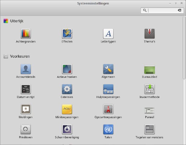 De instellingen zijn onderverdeeld in vier categorieën. Onder Uiterlijk vind je instellingen waarmee je het uiterlijk van Cinnamon aanpast. Onder Voorkeuren pas je het gedrag van Cinnamon aan, zoals voor meldingen, vensters en werkbladen en extensies. Onder Apparatuur staan alle instellingen die te maken hebben met je printer, beeldscherm, geluid, bluetooth, energiebeheer, netwerken, toetsenbord en muis enzovoort. Onder Beheer staan tot slot enkele basisinstellingen zoals voor het aanmeldvenster, firewall, gebruikers en groepen, pakketbronnen en het stuurprogrammabeheer. Overigens vind je in het hoofdmenu onder de categorie Voorkeuren naast bovenstaande onderdelen ook nog een aantal andere programma's voor instellingen, zoals Schijven, Uw bestanden delen, Wachtwoorden en sleutels en Werkomgeving delen.