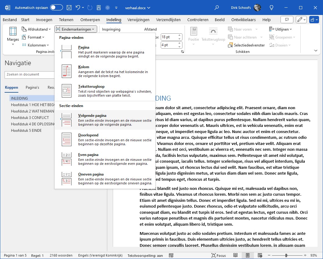 Om delen van een tekst een andere indeling te geven, gebruik je secties. Op die manier kun je bijvoorbeeld zorgen dat pagina 1 tot 5 uit doorlopende tekst bestaat, maar dat daarna de tekst in twee kolommen moet verschijnen. Secties zijn ook de manier om verschillende kop- en voetteksten in hetzelfde document toe te passen. Denk aan een document dat bestaat uit een inleiding en vijf hoofdstukken. Elk hoofdstuk willen we van aparte koptekst voorzien. Plaats de muisaanwijzer voor het eerste hoofdstuk en voeg een sectie-einde toe. Via het tabblad Indeling en de knop Eindemarkeringen plaats je een sectie-einde, namelijk een Pagina-einde.