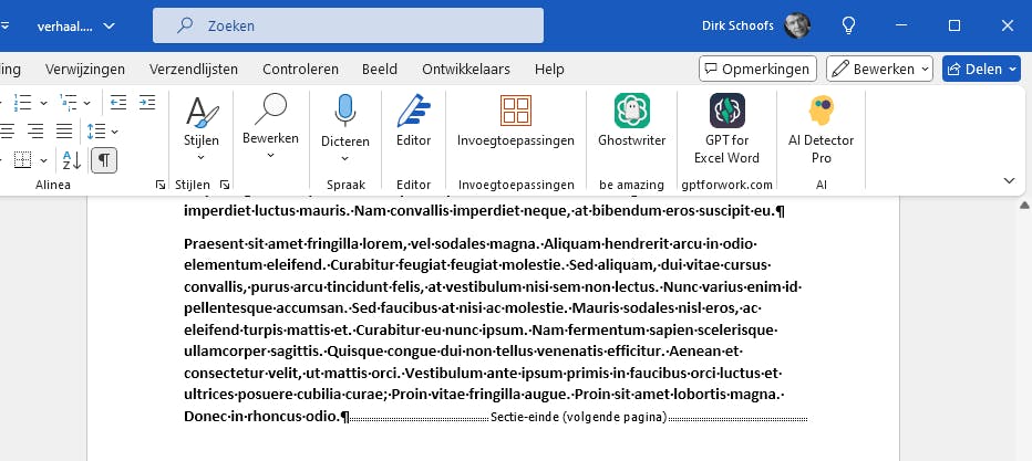Je kunt die sectie-einden beter zien door te klikken op de knop Alles weergeven in het tabblad Start. Deze knop noemt men vaak ook 'onzichtbare tekens'. Je roept deze functie nog gemakkelijker op met Ctrl+Shift+8. Ook bij de volgende hoofdstukken voeg je op dezelfde manier telkens een sectie-einde van het type Volgende pagina toe. Daarbij kun je ook de F4-toets gebruiken. Deze combinatie herhaalt telkens de laatste handeling. Dat gaat dus een stuk sneller.