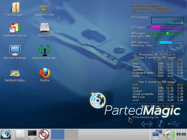 Parted Magic biedt een uitgebreide softwarecollectie voor partitionerings- en hersteltaken.