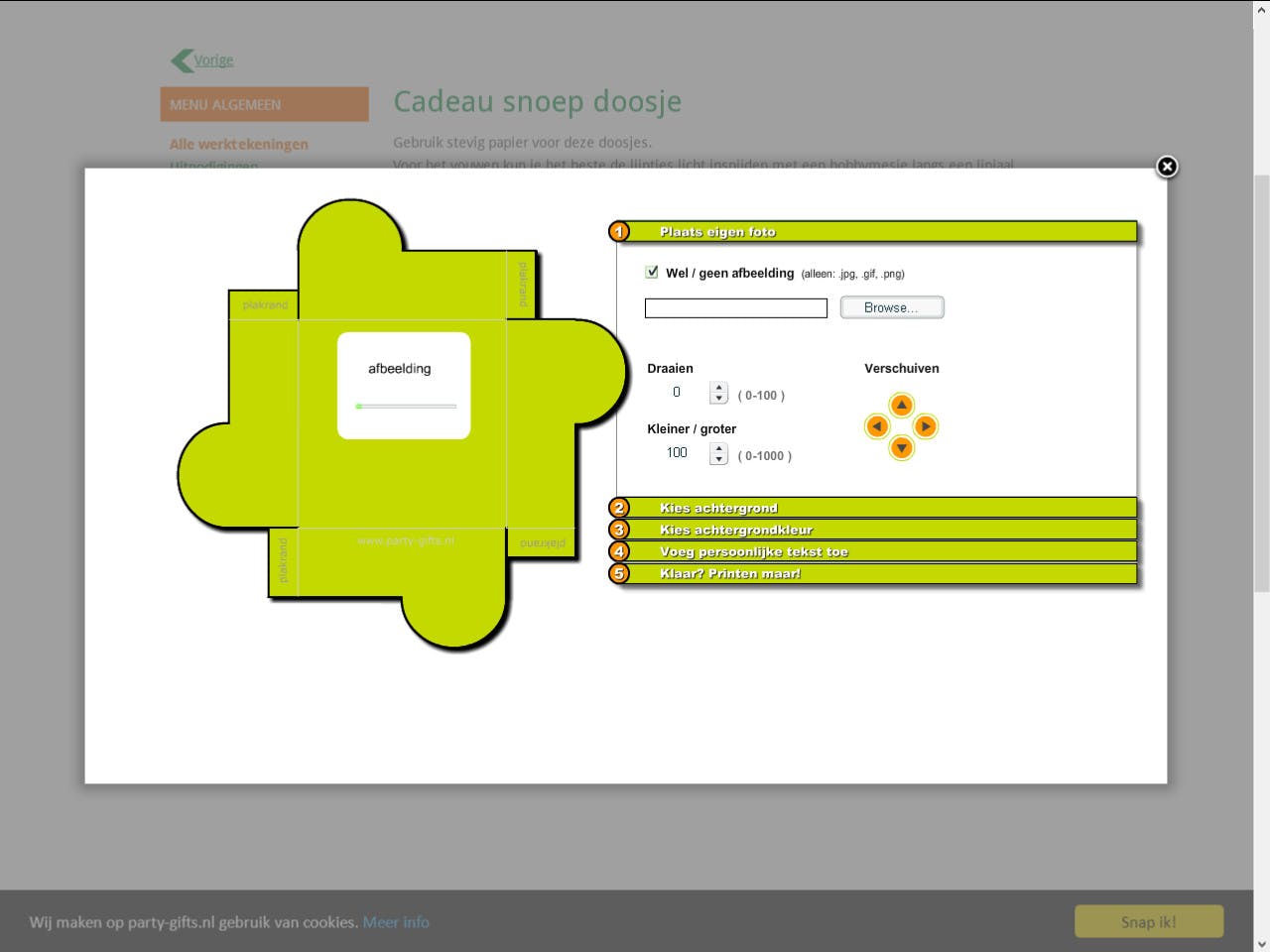Je hebt je vast en zeker voor de afgelopen Sinterklaas weer uit de naad geknutseld om leuke surprises te maken. Dat was ongetwijfeld een goede vingeroefening voor alle cadeau-gelegenheden die nog komen gaan. Wie voortaan wat sneller klaar wil zijn, kan terecht op www.party-gifts.nl, een tip van Jurjen Bakker. Op deze site maak je gemakkelijk bouwtekeningen voor allerlei verpakkingen. Naar je hand zetten, uitprinten, vouwen, lijmen en klaar. Daarnaast vind je aanpasbare ontwerpen voor bijvoorbeeld eigen wijnetiketten, chocoladewikkels, boekenleggers, vlaggetjes, feestmutsen en meer. Let’s party!