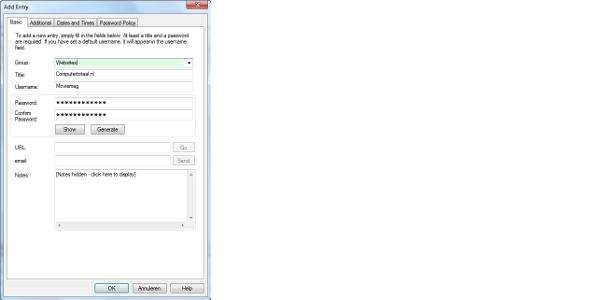 Eerst kiest u een hoofdwachtwoord, dit is het wachtwoord waarmee u al uw andere wachtwoorden beschermt. Hebt u dit eenmaal ingesteld, dan kunt u naar hartenlust wachtwoorden toevoegen. U kunt een groep toekennen (handig voor het categoriseren), bepalen aan welke voorwaarden uw wachtwoorden moeten voldoen (hoofdletters, speciale tekens enzovoort) en aangeven welke gebruikersnaam u altijd gebruikt zodat u deze niet telkens hoeft in te voeren. De interface is daarin heel prettig, bijvoorbeeld omdat u groepen niet eerst in een apart menu hoeft aan te maken, die kunt u gewoon toevoegen of selecteren bij het invoeren. Verder kunt u zelf instellen wanneer een wachtwoord verloopt, complexe wachtwoorden laten genereren enzovoort. Kortom, het programma is lekker uitgebreid en het fijne is dat u tijdens de installatie kunt aangeven of u het programma draagbaar wilt installeren of niet. Waarom dan toch slechts een 7 voor dit programma? Om een hele simpele reden: het programma geeft bij het invoeren van het hoofdwachtwoord aan wanneer dat zwak is, maar laat u vervolgens alsnog dit wachtwoord kiezen als u dat wilt. Dat moet niet ... dat mag niet: een programma als dit moet u juist beschermen tegen uw eigen gemakzucht. Door een zwak hoofdwachtwoord de kiezen maakt u het hele programma nutteloos, want de toegangsdeur tot al uw wachtwoorden kan vrij dan eenvoudig worden ingetrapt.