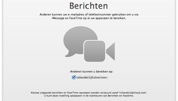 Zorg aan het eind dat het vinkje voor Stel iCloud in op deze Mac aanstaat en accepteer dat Apple je gegevens uploadt en bewaart in iCloud. In het volgende venster kun je ervoor kiezen om je e-mailadres alvast in te stellen voor het gebruik van FaceTime en iMessage.