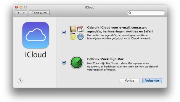 Wil je iCloud activeren op een bestaande Mac, ga dan naar Systeemvoorkeuren / iCloud en log in met je Apple ID. Klik op Log in en zet in het volgende venster een vinkje voor Gebruik iCloud voor e-mail, contacten, agenda's, herinneringen, notities en Safari. Het vinkje voor Gebruik 'Zoek mijn Mac' kun je voor nu even verwijderen. Klik op Volgende.