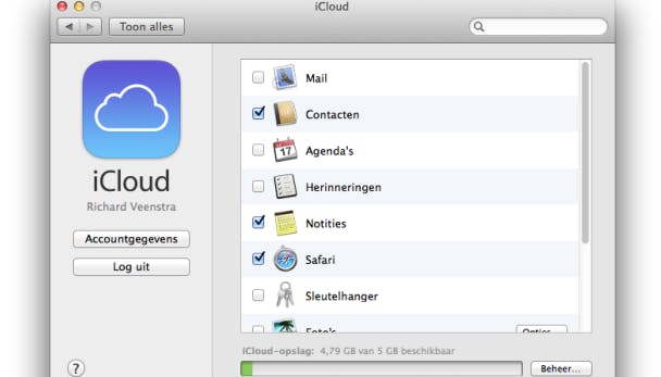 Afhankelijk van het systeem waarop je je bevindt, ziet het configuratiescherm van iCloud er een beetje anders uit. Grofweg vind je er echter dezelfde functies terug. Je vindt er de verschillende onderdelen die je kunt synchroniseren en je kunt bepaalde onderdelen inschakelen voor iCloud en andere uitschakelen.