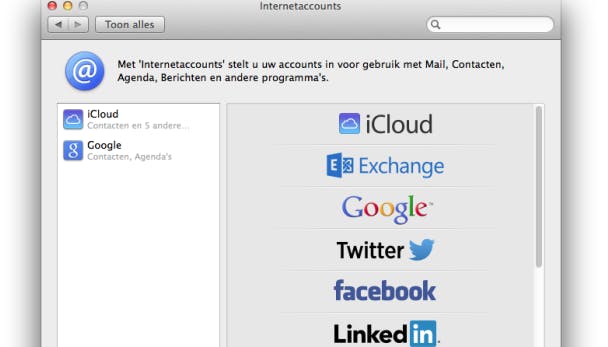 Dit doe je door op Agenda / Accounts te klikken, met het plusje voeg je een account toe. Zorg dat het vinkje voor Agenda's aanstaat in het iCloud-configuratiescherm zodat je agenda's worden gesynchroniseerd.