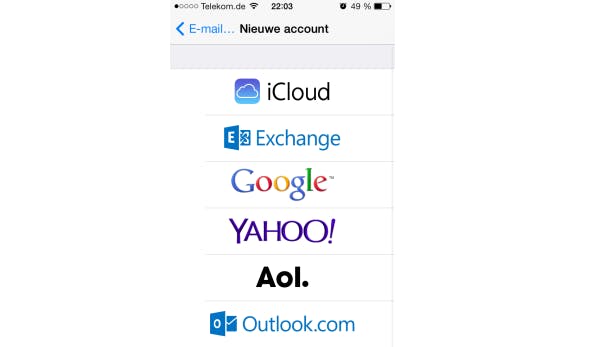 Tik op Nieuwe account en kies wat voor e-mailaccount je wil configureren. Je hoeft hier niet voor iCloud te kiezen, dit werkt alleen als je een apart iCloud.com-mailadres hebt. Heb je een Gmail-account, kies dan bijvoorbeeld voor Google.