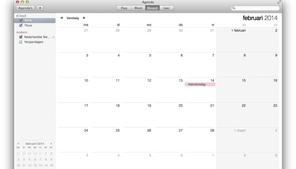 Ga je naar het programma Agenda op je Mac en klik je op Agenda's, dan zie je linksboven twee agenda's onder het kopje iCloud staan. Dit zijn de agenda's die worden gesynchroniseerd met iCloud. Je kunt ook nog andere agenda's toevoegen, zoals een Google Agenda of een Exchange-account.