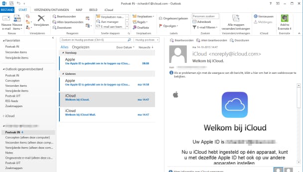 Je kunt geen e-mails of agenda's synchroniseren als je de standaard mail- en agenda-apps van Windows 8 of Windows 10 gebruikt. Open Outlook en je ziet dat links een apart kopje iCloud staat, klik je op Agenda dan zie je je iCloud-agenda's.
