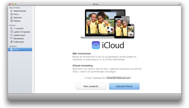 Fotostream op de Mac werkt met het programma iPhoto of Aperture. Als je iPhoto hebt geïnstalleerd, zie je in het programma in de linkerkolom de optie iCloud. Klik erop en kies voor Gebruik iCloud.